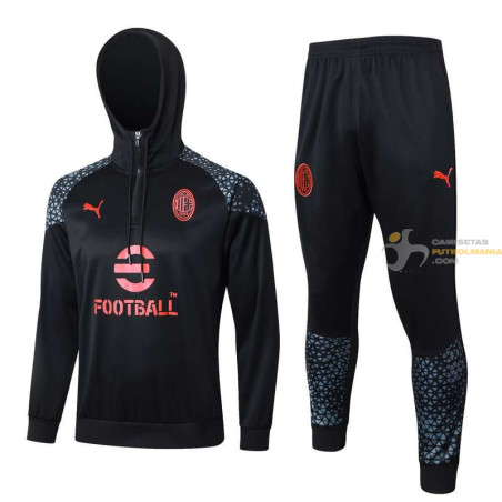 Chándal Capucha AC Milan Negro 2024-2025. MÁXIMA CALIDAD y MÁXIMA COMODIDAD. Tejido técnico de Alta Calidad con ajuste clásico de chándal para la máxima comodidad dentro y fuera del terreno de juego. Diseño réplica para rendir homenaje a tu equipo.