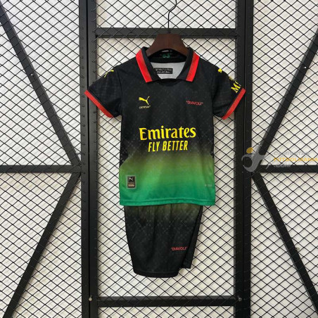Camiseta y Pantalón Fútbol Niños AC Milan Edición Especial "Diavoli" Negra 2024-2025. Se pueden adjuntar medias, talla única adaptable. MÁXIMA CALIDAD y MÁXIMA COMODIDAD.