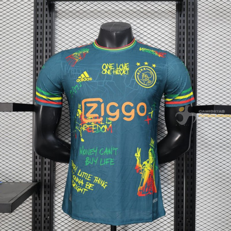 Camiseta Fútbol Ajax Edición Especial Bob Marley Verde Versión Jugador 2025-2026. Se pueden adjuntar medias a juego, talla única adaptable. MÁXIMA CALIDAD y MÁXIMA COMODIDAD. Fíjate bien en la tabla de tallas adjunta en las fotos del producto.