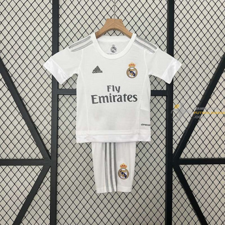 Camiseta y Pantalón Niños Real Madrid Primera Equipación Retro Clásica 2015-2016. MÁXIMA CALIDAD y MÁXIMA COMODIDAD. Tejido técnico reciclado que te ayuda a mantenerte seco y cómodo. Ajuste clásico de camiseta de fútbol para la máxima comodidad dentro y fuera del terreno de juego. Diseño réplica para rendir homenaje a tu equipo.